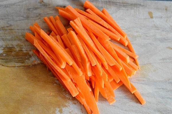 Cortamos las verduras, las cortamos en juliana larga. pelamos y contamos la zanahoria reservamos.