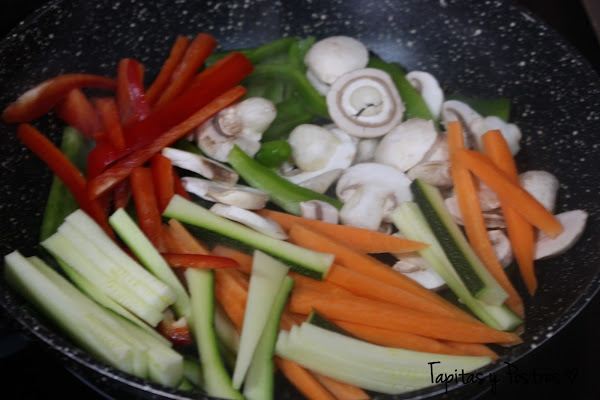Lavamos muy bien la verdura. Pelamos la zanahoria y cortamos todo (menos los champiñones) en bastoncitos. Los rehogamos en una sartén con dos cucharadas de aceite de oliva. Salpimentamos y damos unas vueltas a fuego medio hasta que esté la verdura al dente, unos diez minutos.