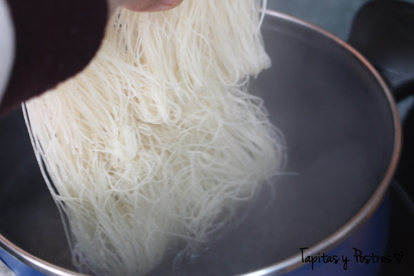 Al mismo tiempo hervimos los fideos de arroz en abundante agua con sal, siguiendo las instrucciones del envase. Dejamos escurrir.