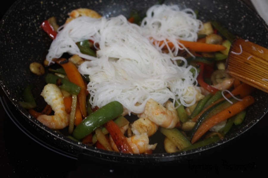 Y añadimos las gambas y los fideos a la sartén con la salsa de soja. Damos unas vueltas para que se impregnen los sabores.