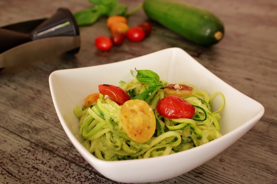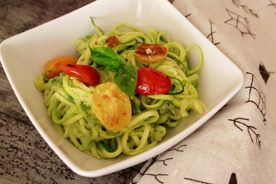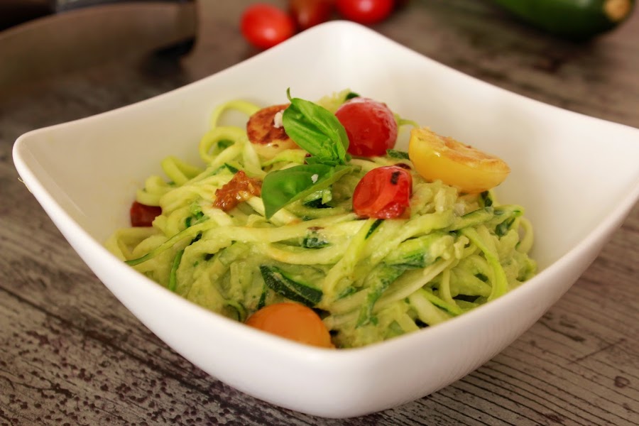 ¡Hola! ¿Qué tal?. Aquí te traigo una nueva receta, ligera, exquisita y fácil, son unos fideos o espaguetis de calabacín con salsa de aguacate (palta) y requesón (ricota), todo esto coronado con tomates cherry salteados que le dan un plus a este plato.