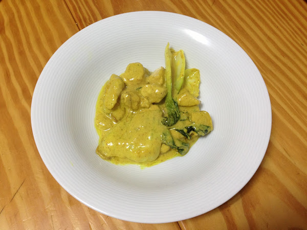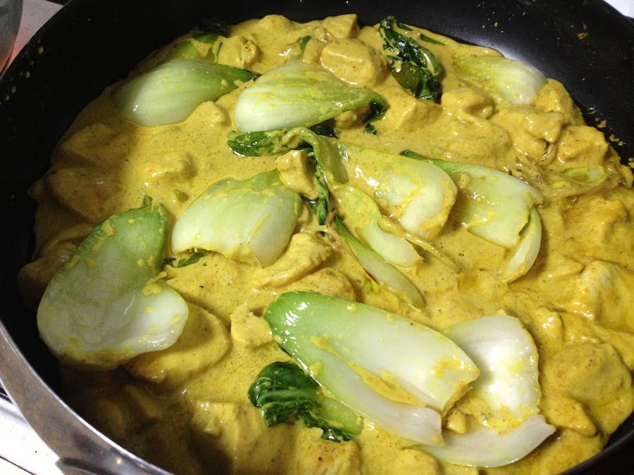 Lo vamos removiendo hasta que veamos que el pak choi se ha ablandado, momento en que lo pasaremos a la sartén con el curry y el pollo, lo removeremos y lo dejaremos reposar. (En este momento pararemos el fuego de la sartén de curry).