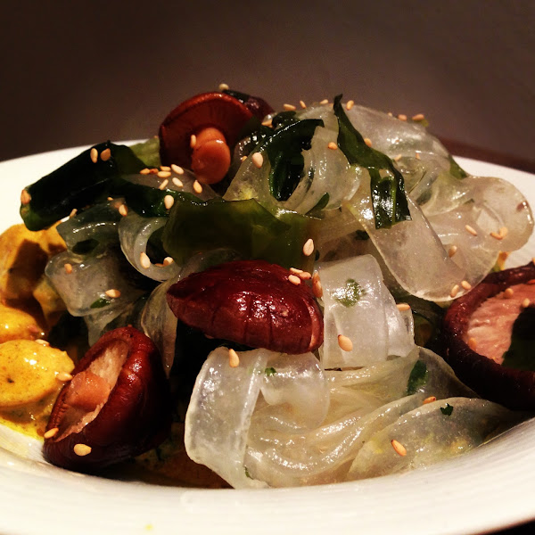 Una vez hemos escurrido los fideos ponemos un poco de aceite de girasol en una sartén, vertemos los fideos y le añadimos las setas ya hidratadas y el wakame que habremos escurrido.