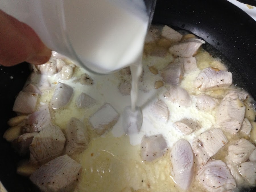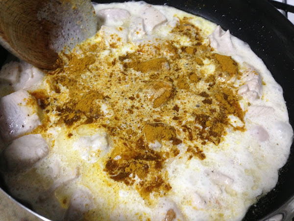 Cuando el ajo empiece a coger color le añadimos el pollo y las almendras, lo removemos y cuando haya pasado 1 minuto le añadimos la nata (crema de leche) y la cucharada de curry. Lo removemos todo y lo dejamos al fuego lento que se vaya haciendo.