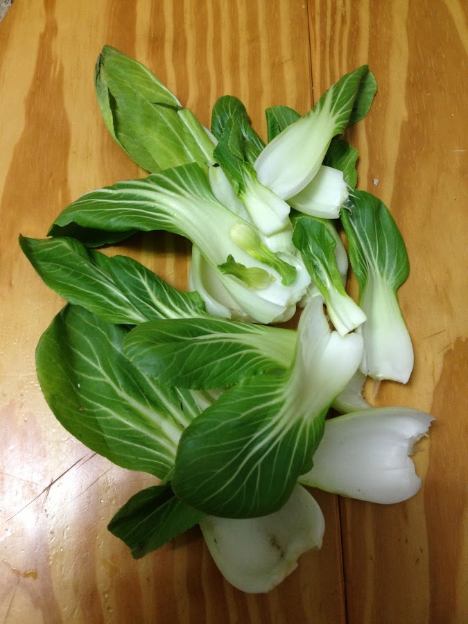 En una sartén ponemos un chorro de aceite de sésamo y ponemos las hojas enteras de pak choi y el puñado de brotes germinados de soja.