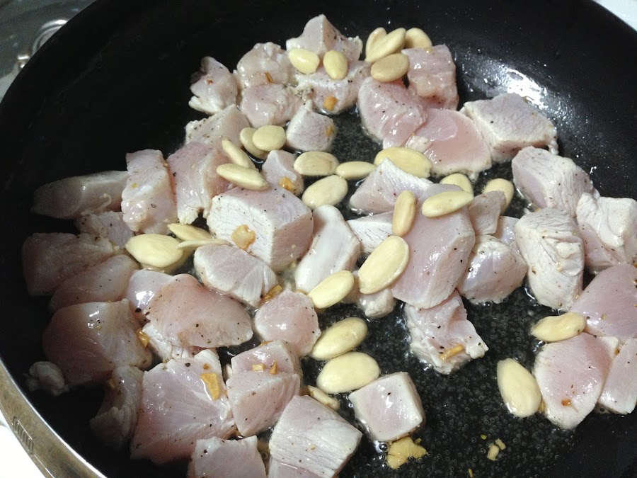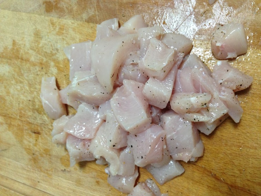 Ponemos aceite de girasol en una sartén, picamos un ajo y lo ponemos en el aceite cuando esté caliente. Mientras el ajo se va haciendo cortamos la pechuga a dados (que sean más o menos iguales entre si) y los adobamos con sal, pimienta negra molida y el jugo de medio limón.