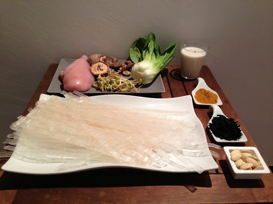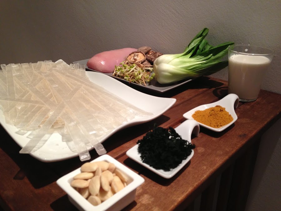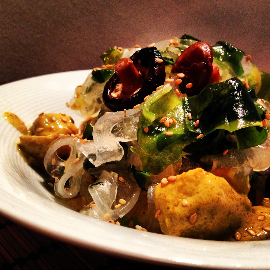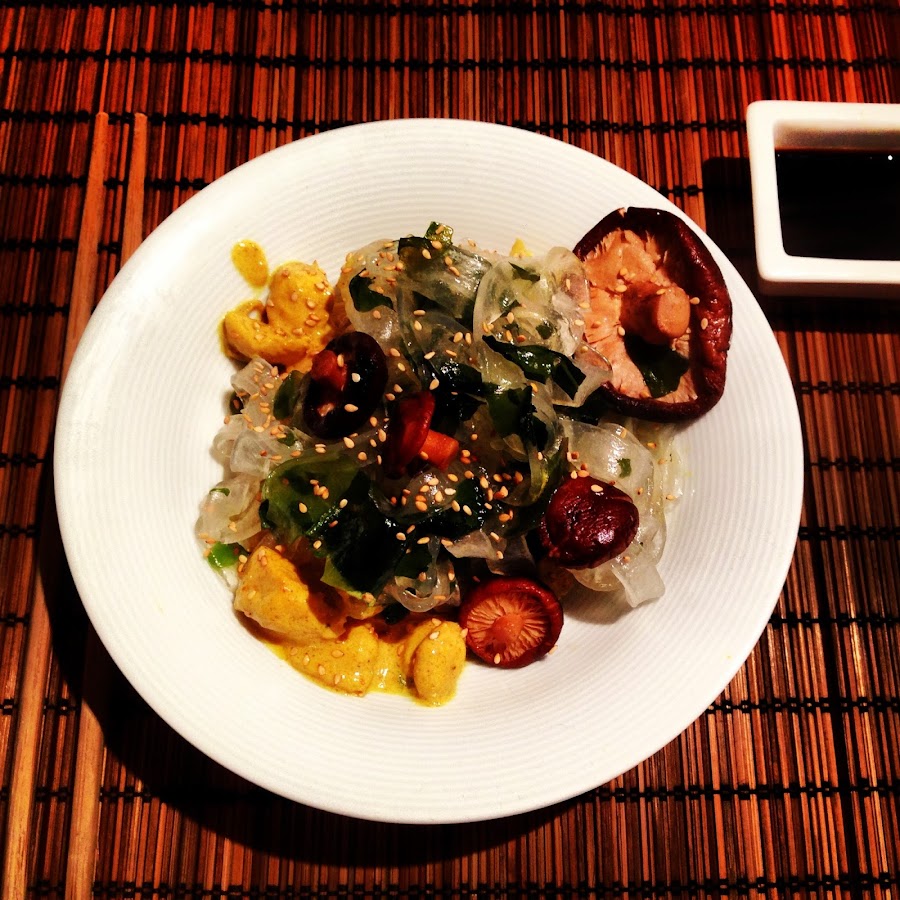 Encima del curry con pollo servimos una ración de fideos (con sus setas y sus algas) y esparcimos unas semillas de sésamo. Podemos acompañar con un poco de salsa de soja por si alguien quiere remojar y dar todavía más sabor a este plato de tintes orientales y exóticos.