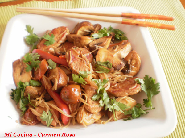 250 grms. de fideos de arroz, 2 cucharadas de aceite vegetal, 350 grms. de solomillo de cerdo cortado en trozos pequeños, 2 dientes de ajo machacados, media cebolla blanca dulce cortada en trozos, cuatro setas tipo Portobello (cortadas en cuatro trozos), 4 tomates cherry (pequeños) cortados por la mitad, medio pimiento rojo cortado en tiras alargadas, 2 cucharadas soperas de salsa de soja, medio vaso de caldo de carne y una ramita de cilantro fresco.