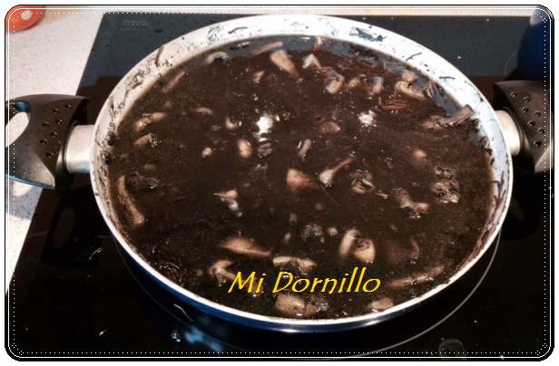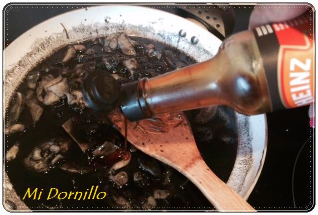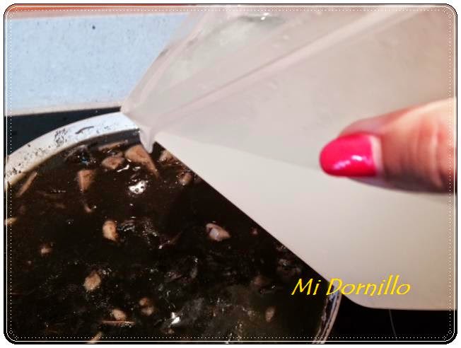 Cuando evapore el vino le ponemos la tinta y la salsa de soja.