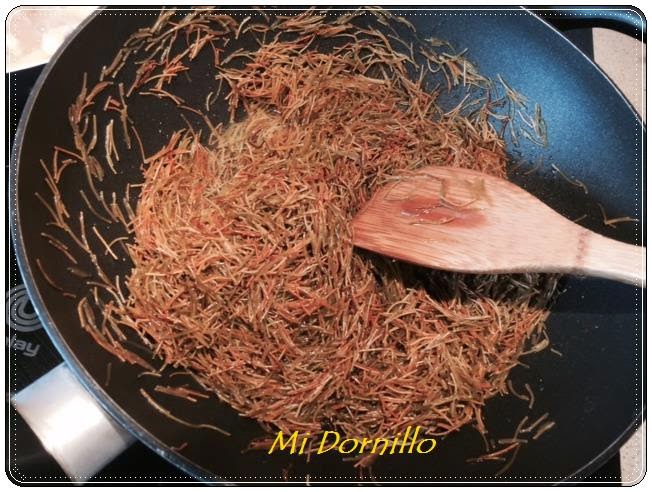 Dejamos cocer a fuego bajo, y mientras en otra sarten refreímos los fideos en un poco de aceite, no mucho.