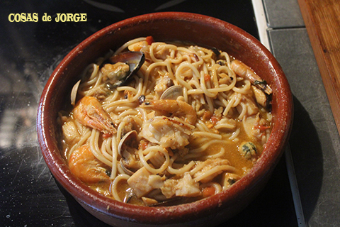 Cuando se mezclen todos los ingredientes, cubrimos de agua, añadimos el pimentón y cuando esta comience a hervir añadimos los espaguetis.