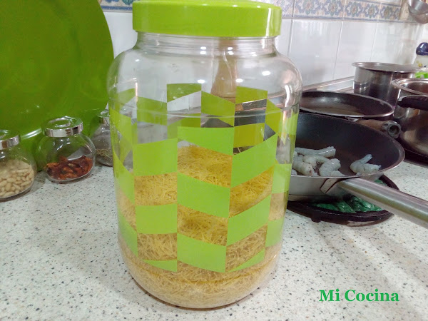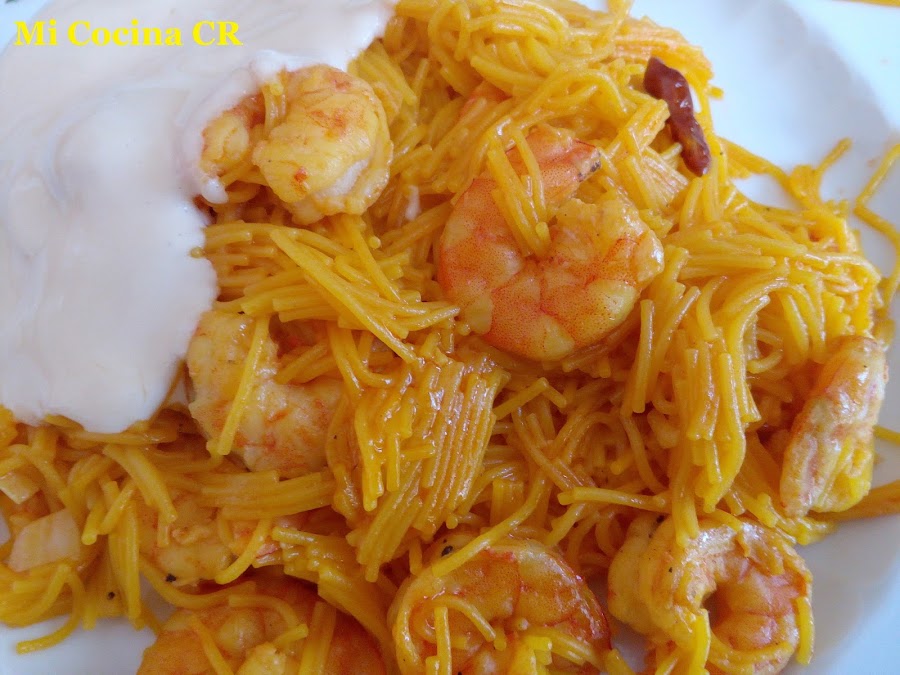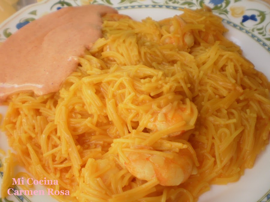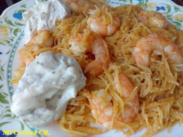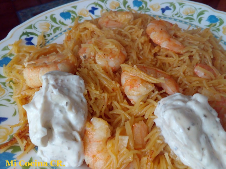 Hoy les propongo preparar algo más de mi tierra, aunque debería decir de mi mar, un plato marinero, marengo….fideos fritos con langostinos, con un toque malagueño, una mayonesa de hierbabuena.