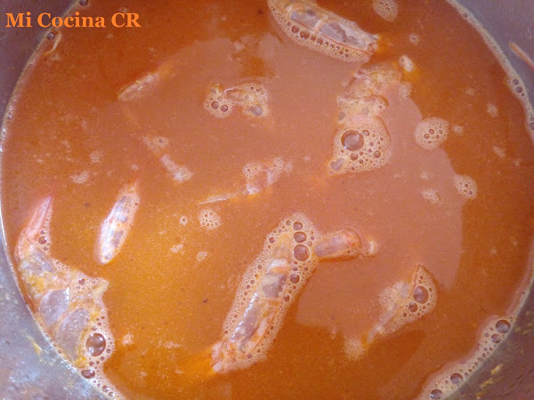 Añadir el resto del caldo, las cabezas y la piel de los langostinos y dejarlo cocer durante unos quince minutos más o menos. Salar al gusto.