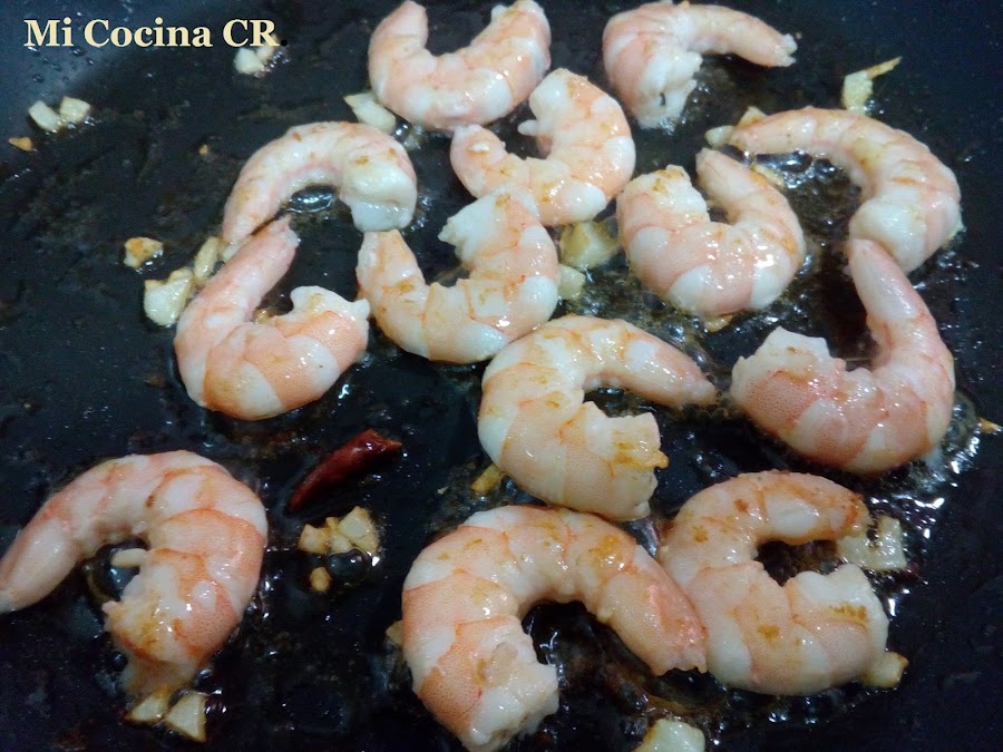 En una sartén echar el resto del aceite de oliva, los ajitos, el pimiento chile y los langostinos; a fuego lento dejar que los langostinos cambien de color, que se doren levemente por ambos lados, con cuidado de que no se quemen los ajos, ni los langostinos.
