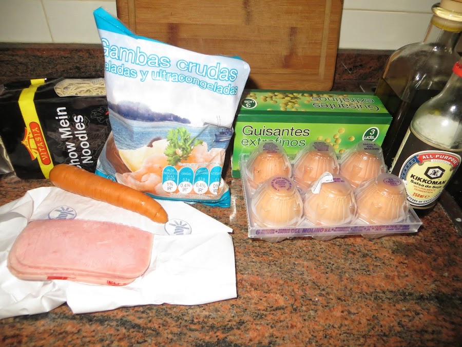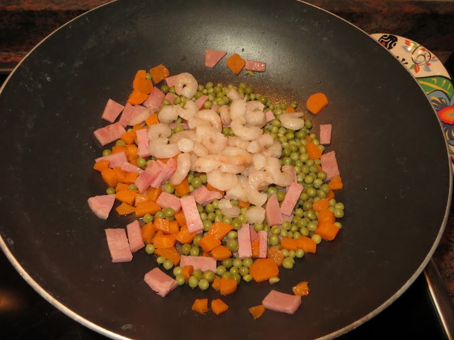 En otra sartén, echamos un chorro de aceite y cuando esté caliente echamos de zanahoria cuando lleve un par de minutos, añadimos el jamón y los guisantes. Le damos varias vueltas y añadimos las gambas peladas. Cuando las gambas cambien de color, añadimos un par de cucharadas de salsa de soja, cortaos la tortilla en tiras y lo añadimos en la sartén.