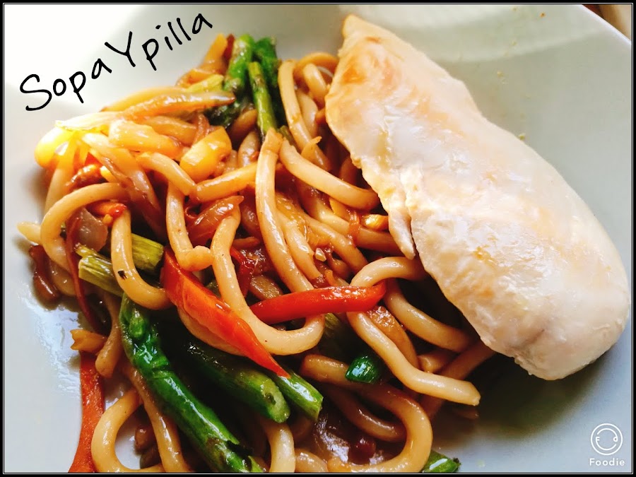 - Añadimos los fideos (son unos paquetes donde vienen ya cocidos) y añadimos soja a nuestro gusto
