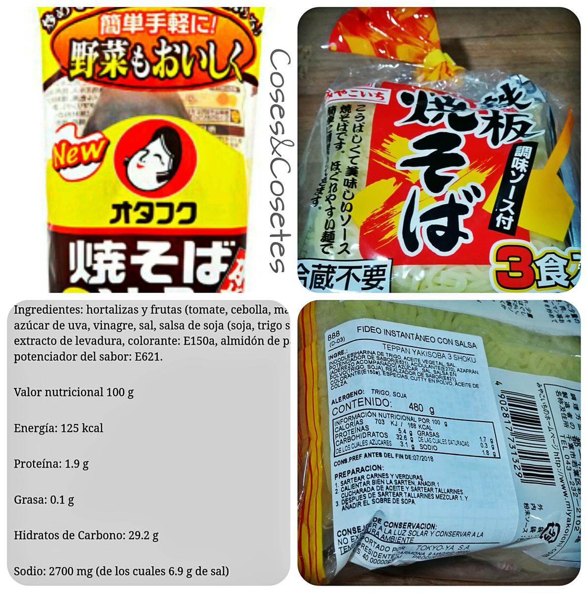 Os dejo aquí la foto de los valores nutricionales de la salsa Yakisoba y de los fideos del mismo nombre (tener presente que este peso es en cocido, no crece porque ya están cocinados), que creo que es algo que os preocupará, pero he de deciros que está muy bien, no para tomar cada día, pero si para darse pequeños caprichos.