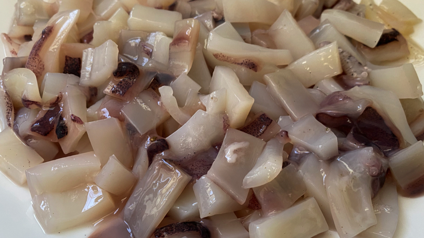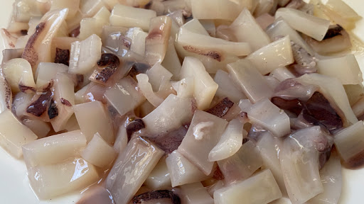 Limpia el calamar (esto te lo puede hacer el pescadero) y córtalo en trocitos muy pequeños.