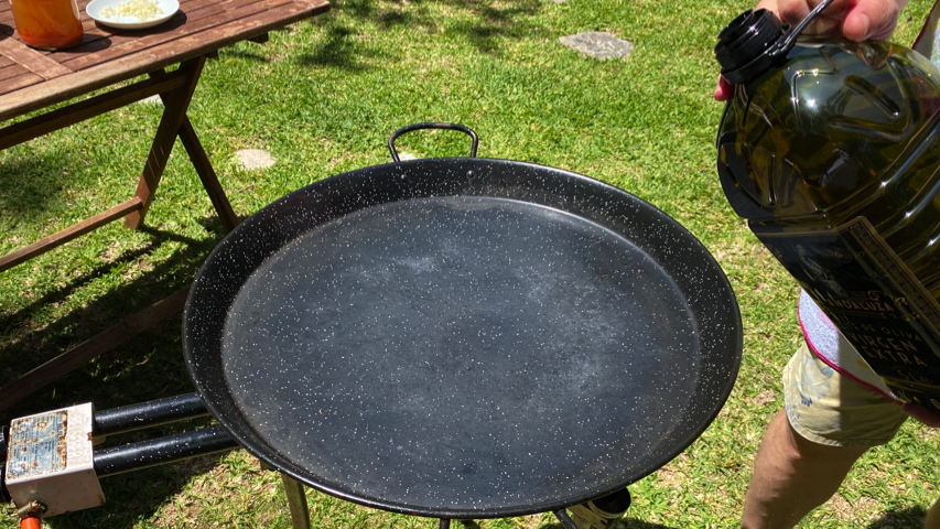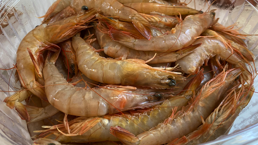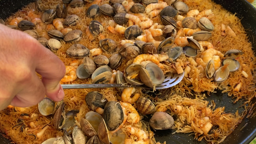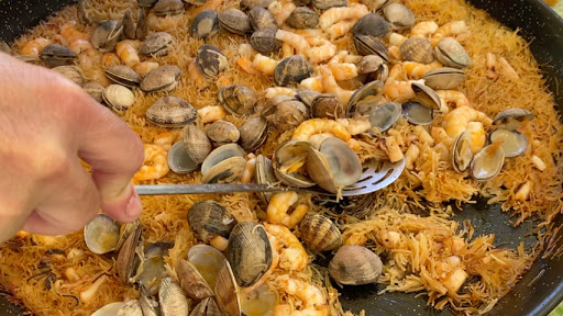 Añade las gambas y repártelas por la superficie de la fideuá.