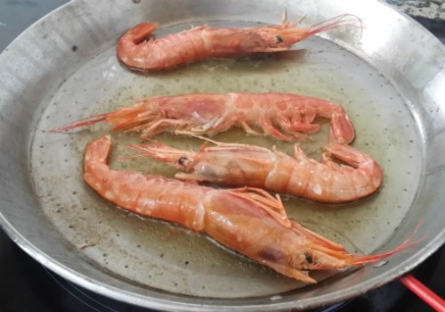 Coloca la paella al fuego y añade 4 cucharadas de aceite. Cuando el aceite esté bien caliente, agrega los gambones y sofríelos.