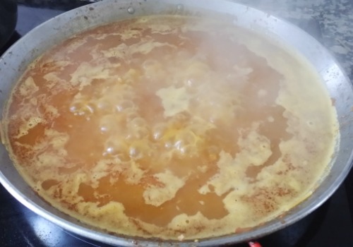1 litro de caldo de pescado (1, 2 litros si no le añadís el agua de cocer los mejillones). Si queréis mi receta para hacer caldo de pescado pulsad aquí. Cuidado con la cantidad de caldo porque he leído recetas en internet que están totalmente equivocadas y ponen una cantidad de caldo como para ahogar al pobre fideo. Para 400 gramos de fideos es suficiente con un litro más el caldito de los mejillones (que no es más de 200 ml)