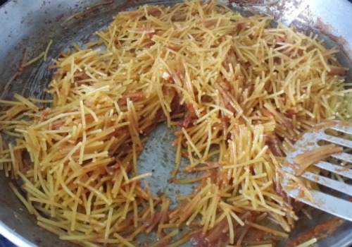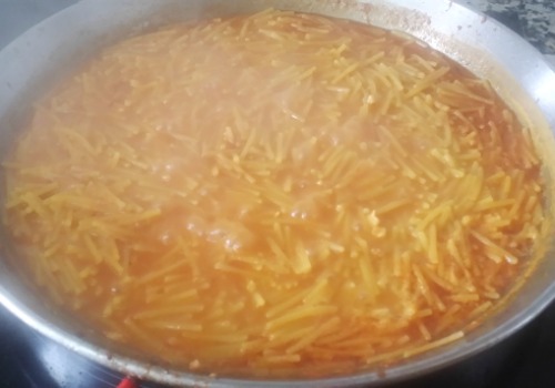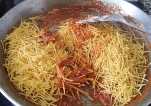 Cuando esté sofrito el tomate incorpora los fideos, rehógalos un poco,