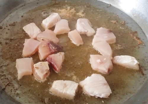 400 gr de cola de rape o pez espada. Nunca pescados blanditos como merluza o bacalao porque se desharían