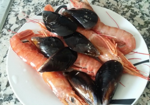 Agrega por encima el pescado, los gambones y los mejillones en una sola valva.