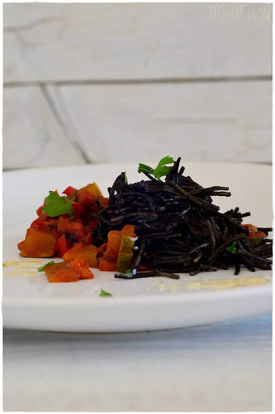 ¿has probado ese crujiente característico de los fideos fritos y de punta al horno? buaaaaa, tienes que estar imaginándote mientras te lo cuento...y si no...YA ESTAS TARDANDO!! seguro que tienes estas verduras y fideos en la despensa...sólo tienes que comprar la tinta...