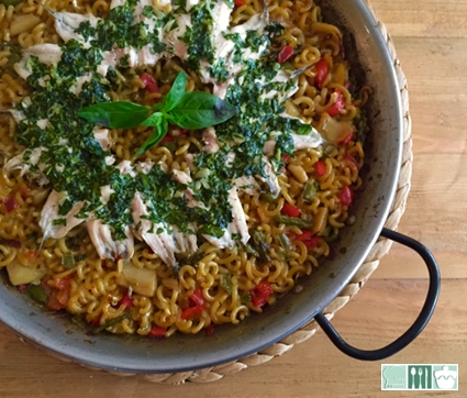 Colocamos los boquerones con la piel hacia abajo sobre los fideos. Repartimos el majado y metemos en el horno precalentado a 210º con aire, entre 5-7 minutos.