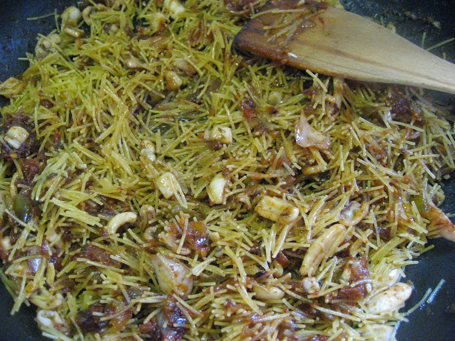 6º " Ponemos el sofrito en la paellera, añadimos los fideos y le damos un poco de fuego en seco, dos minutos dándole vueltas y le añadimos el caldo, solo hasta que este cubra los fideos, lo metemos en el horno unos 5 minutos y listo, ya tenemos nuestros fideos con gambas, solo nos queda presentar el plato y listos.