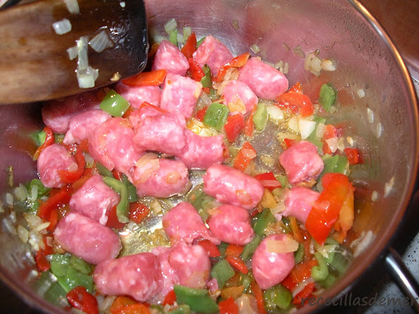 En una sarten poner un chorro de aceite de oliva, y sofreir la cebolla picada a fuego bajo, añadir el diente de ajo picado y los pimientos troceados. Sofreir todo junto. Cuando la verdura este blanda añadir las salchichas troceadas y freír. Agregar el vino y dejar todo junto unos minutos hasta que el vino se evapore.