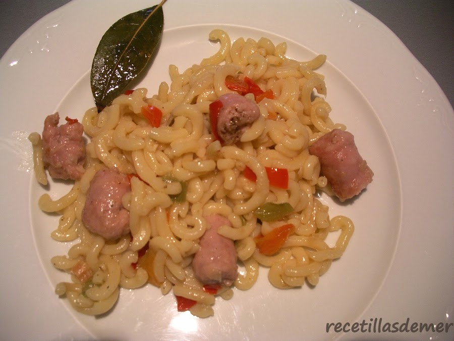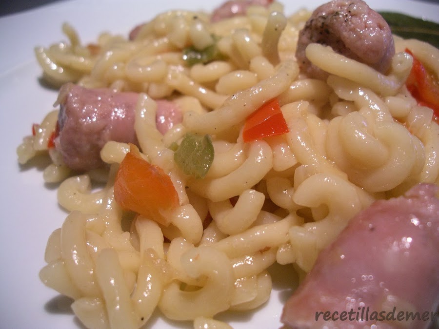 Añadimos la pasta a la sarten y mezclamos todo bien. Ahora, incorporamos el caldo caliente, un poco de sal y también un poco de pimienta. Cocer todo junto hasta que la pasta este cocida, unos 15 minutos. Cuando este casi, se retira del fuego y se deja tapado.