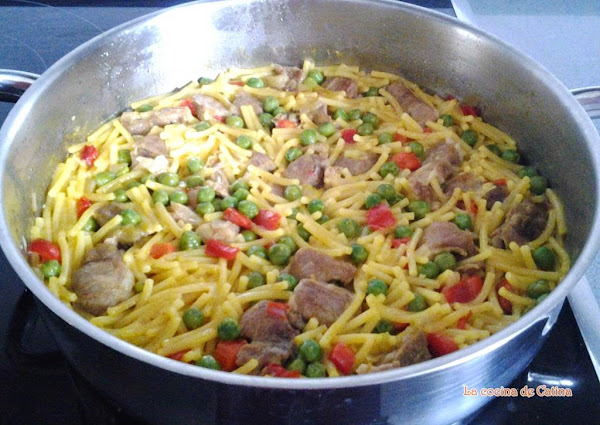 Ponemos 2,5 porciones de agua por una de pasta, rectificamos de sal y añadimos las hebras de azafrán picadas. Dejamos a fuego vivo hasta que se evapore toda el agua.