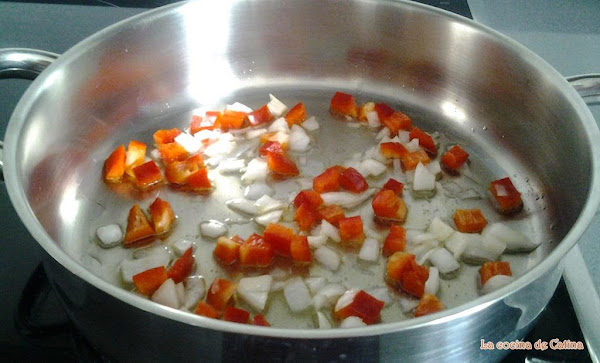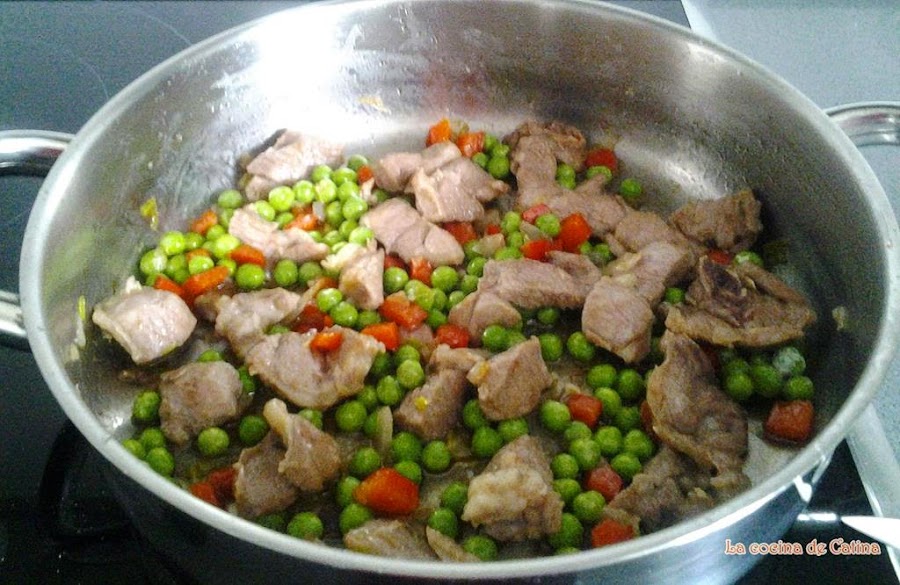 En una cazuela baja o paellera echar 4 cucharadas de aceite y ponerla a calentar. Sofreímos los trozos de carne, cuando están dorados los sacamos y reservamos. En el mismo aceite, añadir el pimiento rojo los ajos y la cebolla cortados en dados pequeños, sofreímos durante unos minutos hasta que el pimiento y la cebolla se vean blanditos. Añadimos los guisantes, le damos unas vueltas y sofreímos durante 5 minutos.