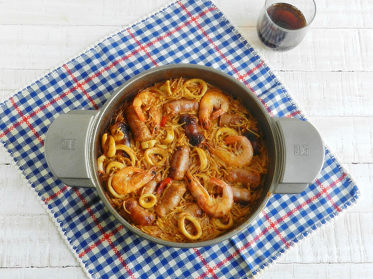 Así que ya pensando en el finde os dejo uno de esos platos que tanto me gustan a mi para el finde. Una rica fideuá pero con combinación carne y marisco que a mi personalmente me encanta! Si, ya se que parece raruno eso de mezclar butifarra (a poder ser con pimienta) con langostinos y con calamares, pero si me hacéis caso no os arrepentiréis! Está de vicio!!