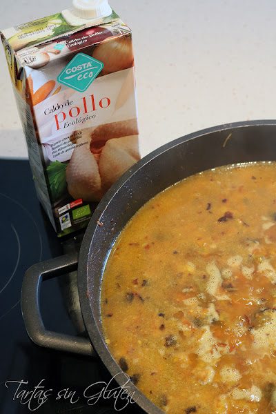El caldo de "Caldo de pollo Costa Eco" , un caldo sin gluten y bajo en grasas. Para los fideos, a nosotros los que más nos gustan son los fideos finos de Gallo sin gluten, me resultan los mejores.