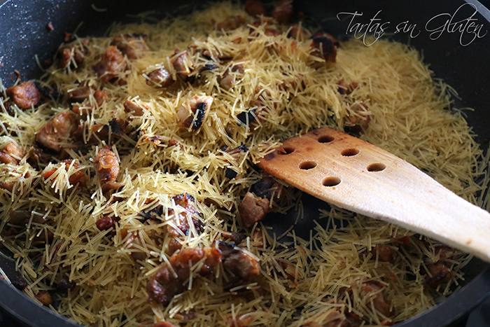 Incorporamos los fideos y rehogamos , para tostarlos ligeramente.