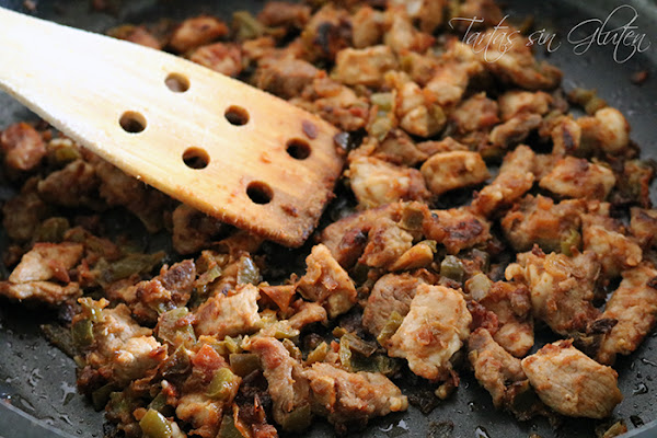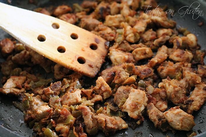 Añadimos la carne y el tomate frito al sofrito, y cocinamos unos minutos.