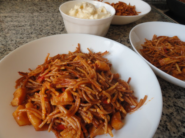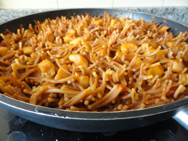 salsa alioli para acompañar si os gusta, yo le pongo un poquito porque le va muy bien.Ponemos a dorar los fideos hasta que cojan un color doradito, cuidado que se queman rápido, y reservamos.