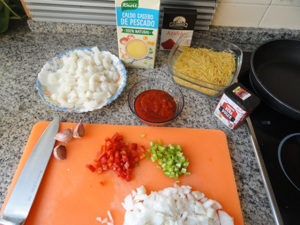 En un poco de aceite sofreimos los ajos picaditos, a continuación la cebolla en brunoise, los pimientos, y cuando esté pochado agregamos la cucharadita de pimentón e inmediatamente para que no se queme ponemos el tomate y el azafrán, la pimienta, echamos el choco y damos unas vueltas. Como el choco necesita poca cocción, podemos tener preparado el refrito junto con el choco y diez minutos antes de comer incorporamos los fideos y el caldo de pescado, que cueza hasta que estén tiernos los fideos, rectificamos de sal ( yo puse la sal en el último momento porque el caldo ya aporta sal ), y si gusta, ponemos una cucharadita de alioli. Está muy rico, es fácil de preparar y si sobra, como ha sido nuestro caso, se guarda en el frigorífico y al otro día está igual de rico.