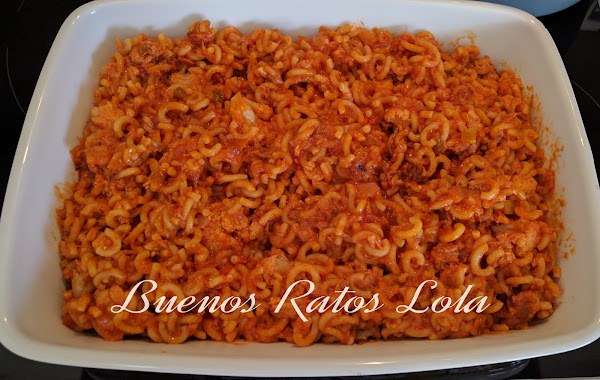 Echa en la cubeta el atún en aceite de oliva, ligeramente escurrido. Mezcla bien. Añade la pasta y la coliflor reservada. Pon el tomate frito y el agua; como siempre se tienen que ver las puntas de los fideos. Remueve y prueba para rectificar la sal.