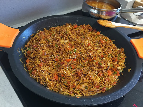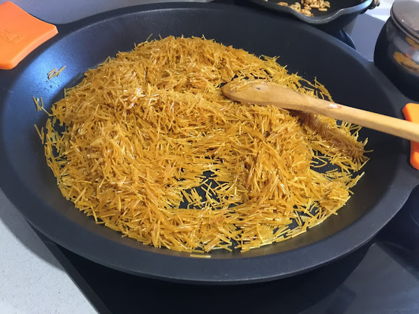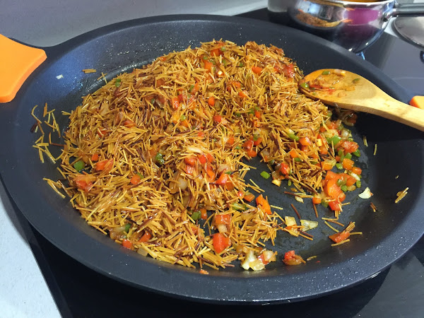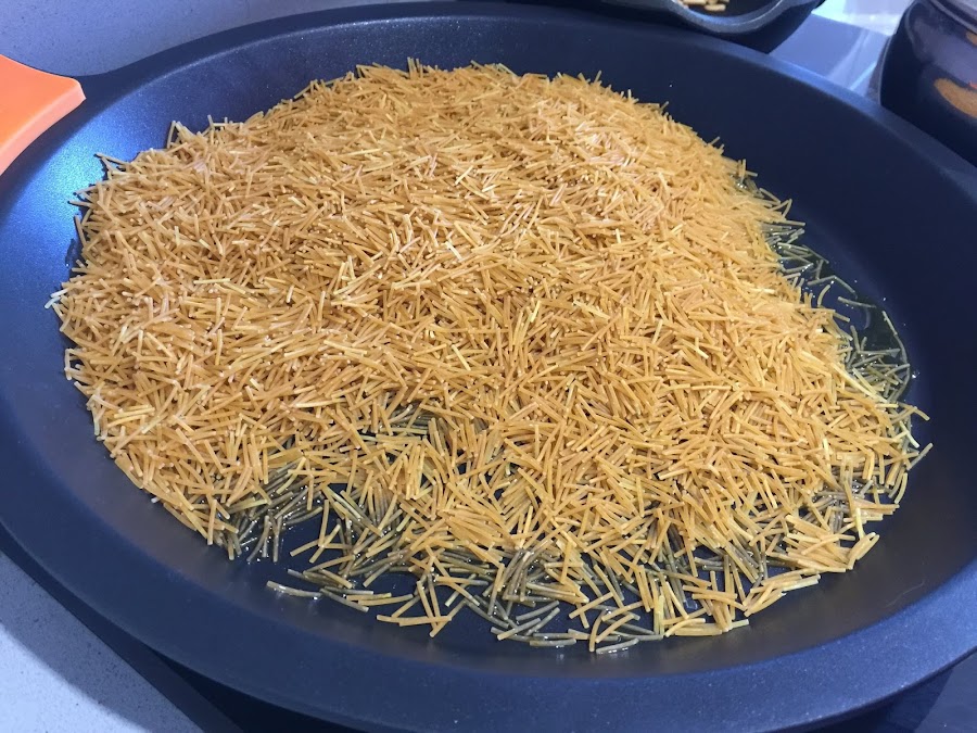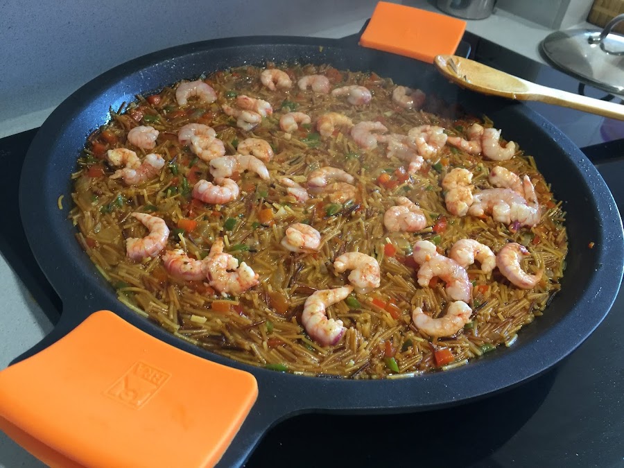 4. Empezamos la fideuá. Añadimos aceite de oliva virgen extra en la paella, tiene que haber bastante y echamos los fideos, se deben tostar, no tengáis miedo si alguno se quema, estará bueno, pero sobretodo estar un ratito dando vueltas a fuego medio hasta que todo esté doradito, cuesta un poco pero paciencia, en 6-7 minutos estará listo, los reservamos para más adelante. Es muy importante realizar este paso para que el fideo quede al dente, y nada gachoso.