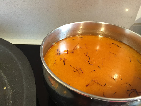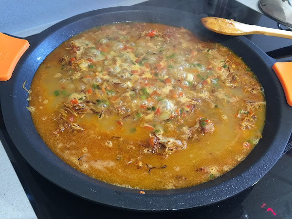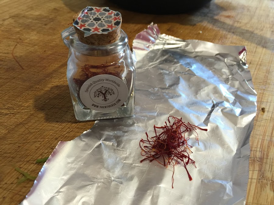 7. El secreto de toda fideuá se guarda en un botecito tan chiquitito y bonito como este. Ya sabéis que confío plenamente en los productos de yaentucasa, este azafrán ecológico está considerado uno de los mejores del mundo, porque mezcla lo mejor Iraní, Griego, Indí y Marroquí. Aporta un color y un aroma sublimes al plato que se añade. Para preparar el azafrán cogemos unas hebras y las envolvemos en papel de plata. Con un mechero quemamos la base del paquetito hasta que salga algo de humo, abrimos rápidamente el papel de plata y ponemos las hebras en el fumet caliente.