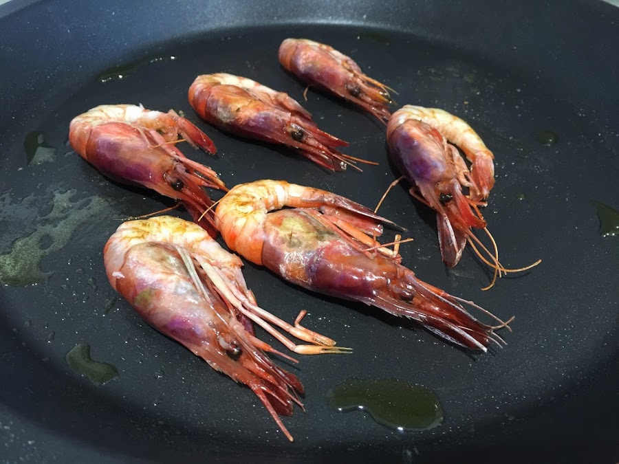 5. Una vez hemos retirado el fideo tostado seguimos con las gambas de Palamós. Para preparar las grandes, pelamos con delicadeza su cola y marcamos en la paella con un chorrito de aceite durante 1 minuto por cada lado, no más. Las pequeñas las sofreímos 30 segundos y las reservamos también para más adelante.