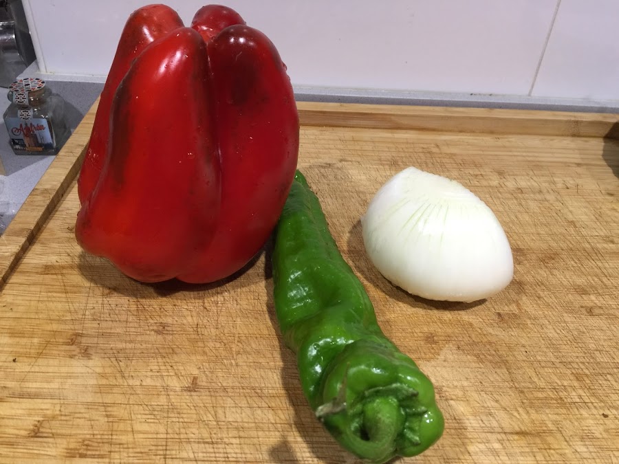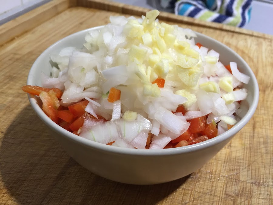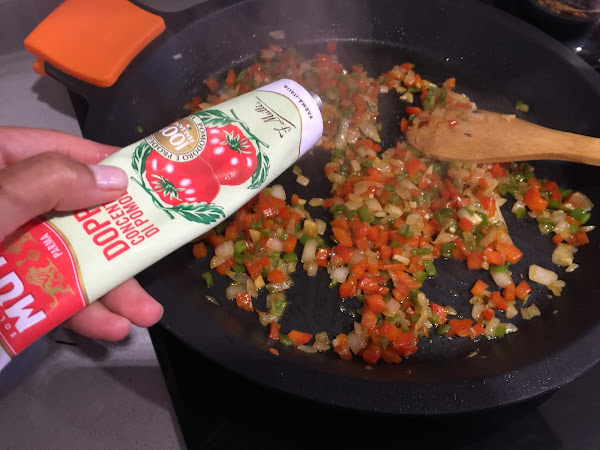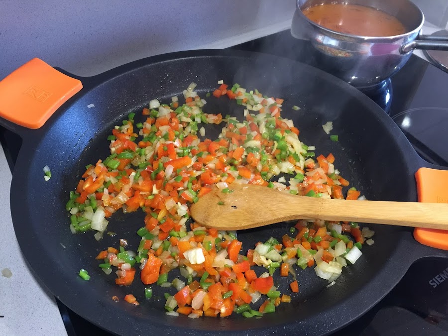 6. Preparamos las verduras. Nos hace falta medio pimiento rojo, uno verde, media cebolla y dos dientes de ajo. Las cortamos en brunoise, lo más pequeñas posible. Añadimos un chorrito de aceite de oliva virgen extra a la paella y sofreímos durante 7-8 minutos a fuego medio. Añadimos la cucharada de concentrado de tomate y sofreímos 1 minuto más.