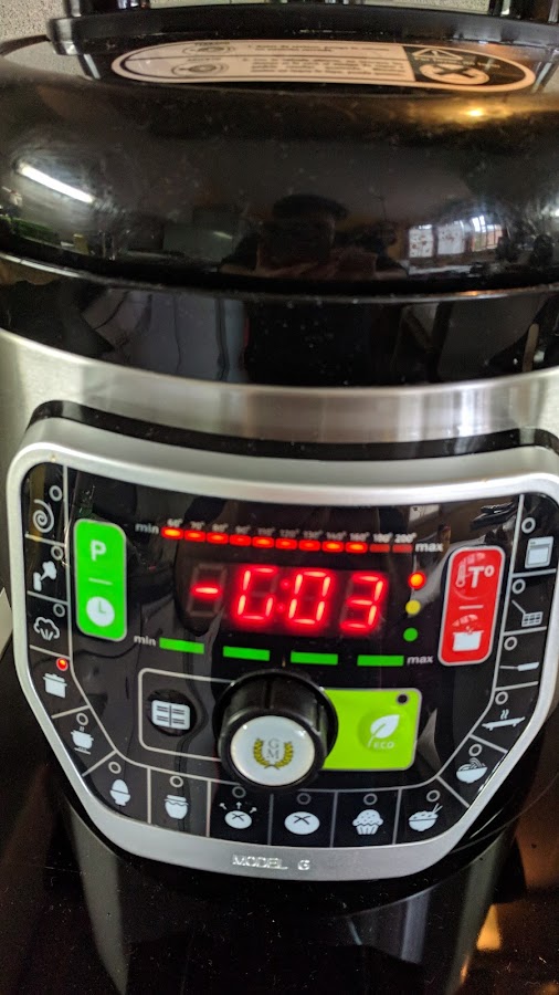 Programamos guiso, 3 minutos a 160 grados y presión predeterminada. En el paquete decía 9 minutos de cocción; al poner mucho caldo hay que reducir un poco el tiempo