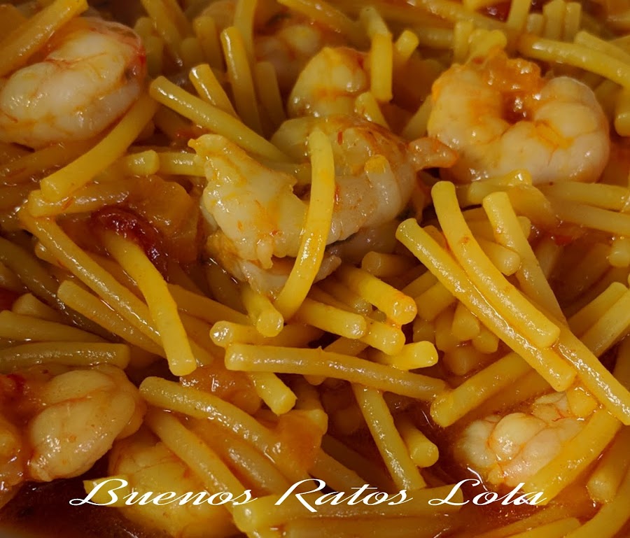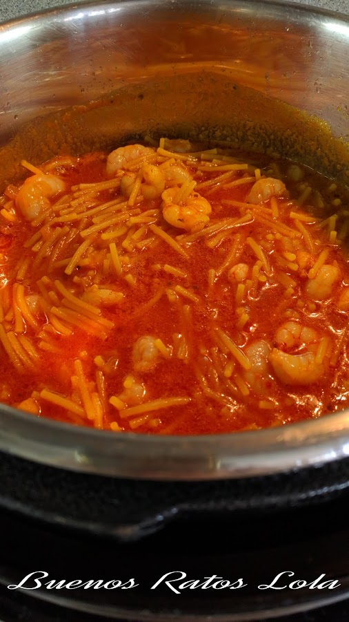 Removemos muy bien. Por último echamos los fideos y salteamos. Ponemos el caldo, que tape los fideos; probamos y si hace falta rectificamos la sazón. Por último las gambas congeladas