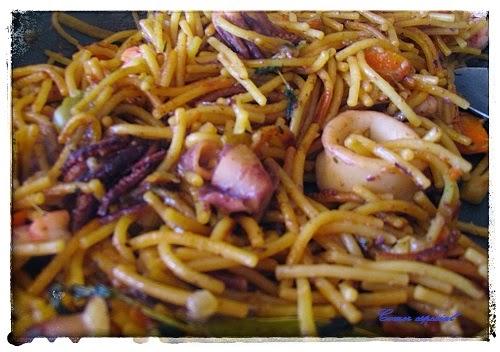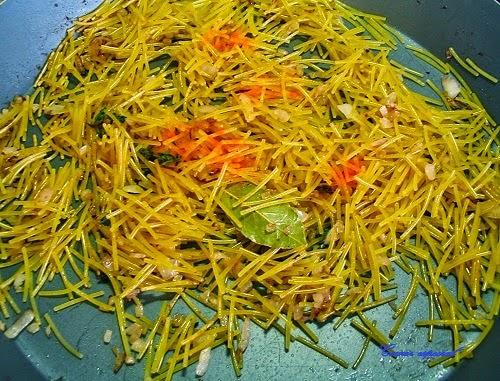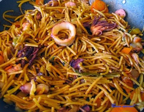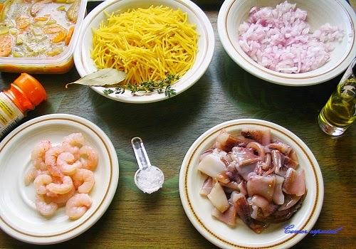 INGREDIENTES (para dos personas): 600 mililitros de fondo de caldo (mejor tener preparado 1 litro por si nos hace falta más), 200 gramos de fideos gruesos sin agujero, 100 gramos de calamares, 50 gramos de gambas, cebolla troceada, laurel, romero, colorante, sal, un poco de aceite.