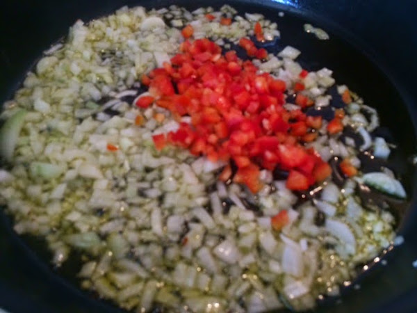 En una paellera, poner el aceite a calentar y echar la cebolleta y el pimiento picados en brunoise (cuadraditos) y pochar 7-10 minutos a fuego medio.